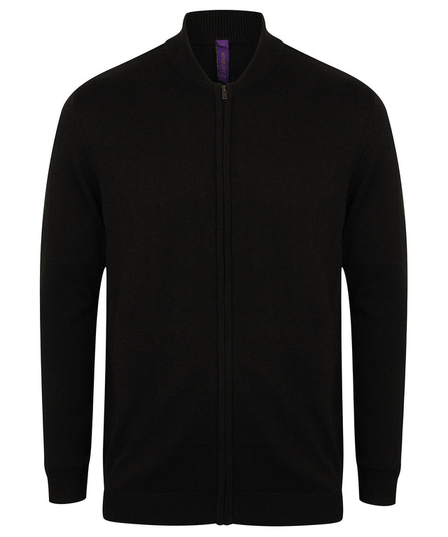 Fine knit, 12 gauge unisex bomber jacket. Semi-fashioned sleeve with full front zip opening. Metal zip and puller. 1x1 neck rib, hem and cuffs. Welted front pockets. Henbury cut-out brand label. Co-ordinates with HB720 product range.Product Features