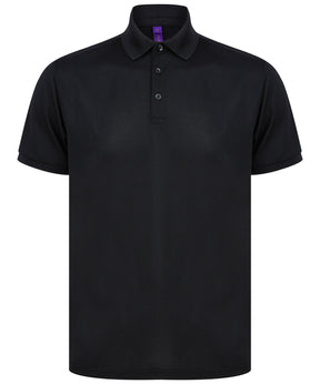 Polo shirt made from recycled polyester yarn with wicking properties. Regular fit with 3 button placket. Henbury stand-up collar. 1x1 ribbed collar and cuffs. Dyed to match buttons.
