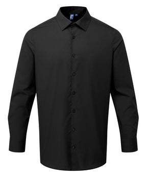 Men’s poplin shirt made with certified recycled polyester and cotton. Stiffened formal collar with top button. Full button-through with pearlised buttons on white and self-coloured on black. Two-button adjustable cuff with cufflink hole. Sleeve guard with single button. Curved hemline. Back darts and yoke for overall fit and shape. Easycare fabric.Sizing to Fit: S 34" M 38" L 42" XL 46" 2XL 50" 3XL 54" 4XL 58" 5XL 62"