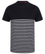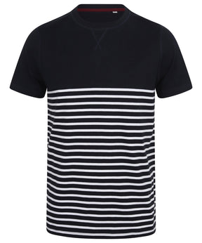 Tag free regular fit, heavyweight short sleeved t-shirt. Crew neck with stretch ribbed neckline. Twin-needle stitching at cuffs and hem. 'V' flatlock stitching detail at neck. Flatlock stitching at neck, shoulder seam and armholes. High chest seam. Striped lower body; contrast plain upper body and sleeves. Coordinates with FR134 long sleeved Breton T.Product Features
