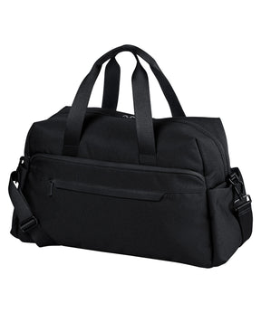 Minimalist styling. Zipped main compartment. Premium-finish internal lining. Three slip pockets inside main compartment. Two large end slip pockets. Rear zipped pocket doubles as a sleeve to slide over a suitcase handle. Outer zipped front pocket with rain flap and internal slip pockets. Detachable adjustable shoulder strap. Premium webbing carry handles. TearAway label for ease of rebranding. Overhead cabin luggage size – suitable for most airlines. 100% certified recycled polyester fabric.