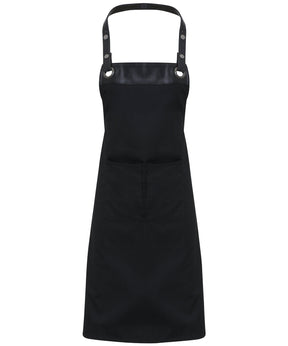 This apron combines polyester-cotton with soft faux leather for a really cool contemporary design. The top of the apron has a deep faux leather trim with two large eyelets which the neckband loops though. The neckband is adjustable on each side with two press stud buttons. A centre pocket stitched down the middle to create two handy bellow style pockets completes this quirky apron.Product Features