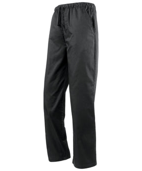 Unisex pull on chef’s trouser. Available in Black or White check or plain Black. Elasticated waist for easy pull on trouser. Unisex sizing. 30.5" inside leg. Side swing pockets. Drawcord.Product Features