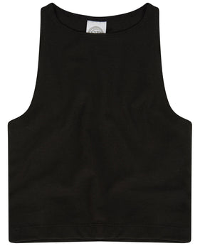 Kids cropped top with racer shape on front and back on neckline. Twin-needle stitching on hem, armholes and neckline. Cropped length. Tear-out label.Product Features