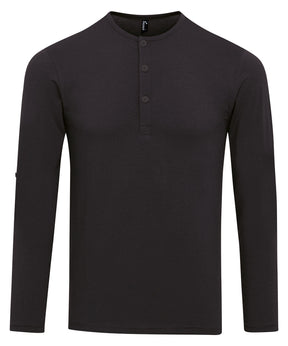 Long sleeve tee that has roll sleeve capabilities with button tab on the inside of the sleeve to secure in place. Round neck style with three a button placket. Twin-needle stitching to the hem and cuff.
