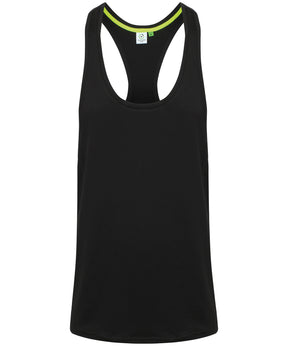 Shaped work out vest, lightweight soft hand feel fabric, self fabric binding, tear-out label.Product Features