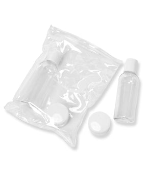 Travel bottle set with transparent PVC pouch. Includes 4 travel-sized reusable plastic bottles. Bottle size within accepted airline travelling limitations.Sizing to Fit: One size