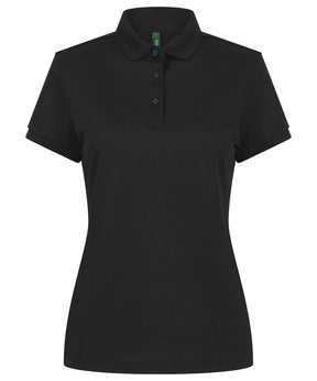Polo shirt made from recycled polyester yarn with wicking properties. Regular fit with three-button placket. Henbury stand-up collar. 1x1 ribbed collar and cuffs. Dyed-to-match buttons. Female fit with shaped side seams. Henbury cut-out label for easy rebranding.