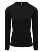 Long sleeve tee that has roll sleeve capabilities with button tab on the inside of the sleeve to secure in place. Round neck style with a three button placket. Twin-needle stitching to the hem and cuff.